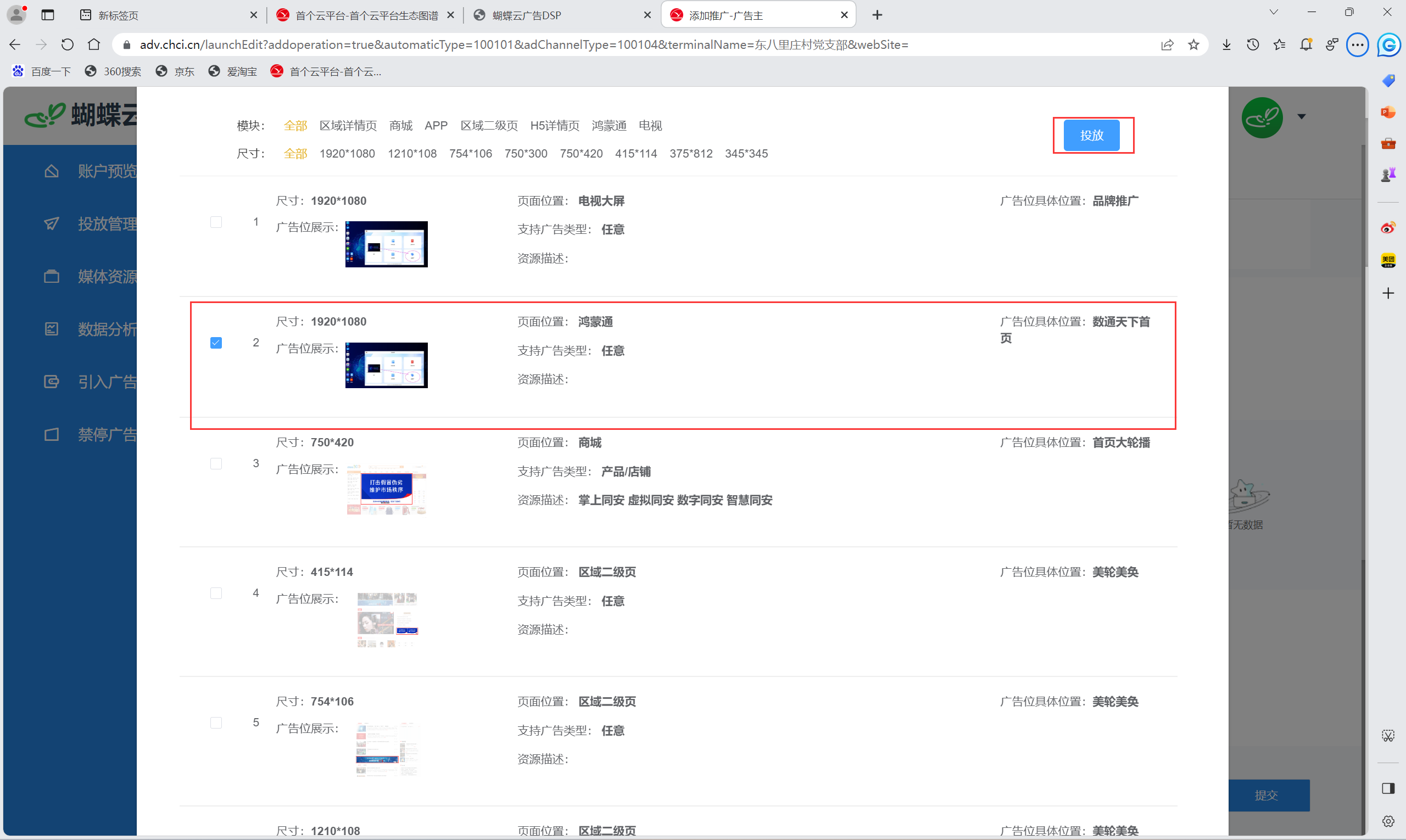 (4)广告位选择:选择广告位的模块与尺寸,选择好之后,点击投放。