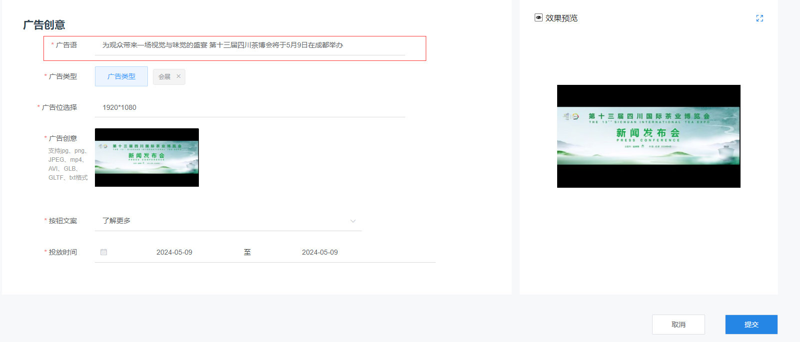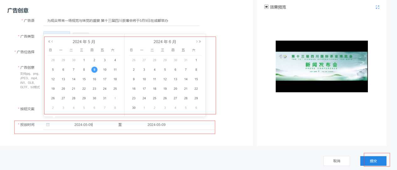 (7)选择投放时间,效果预览无误后,点击提交即可。