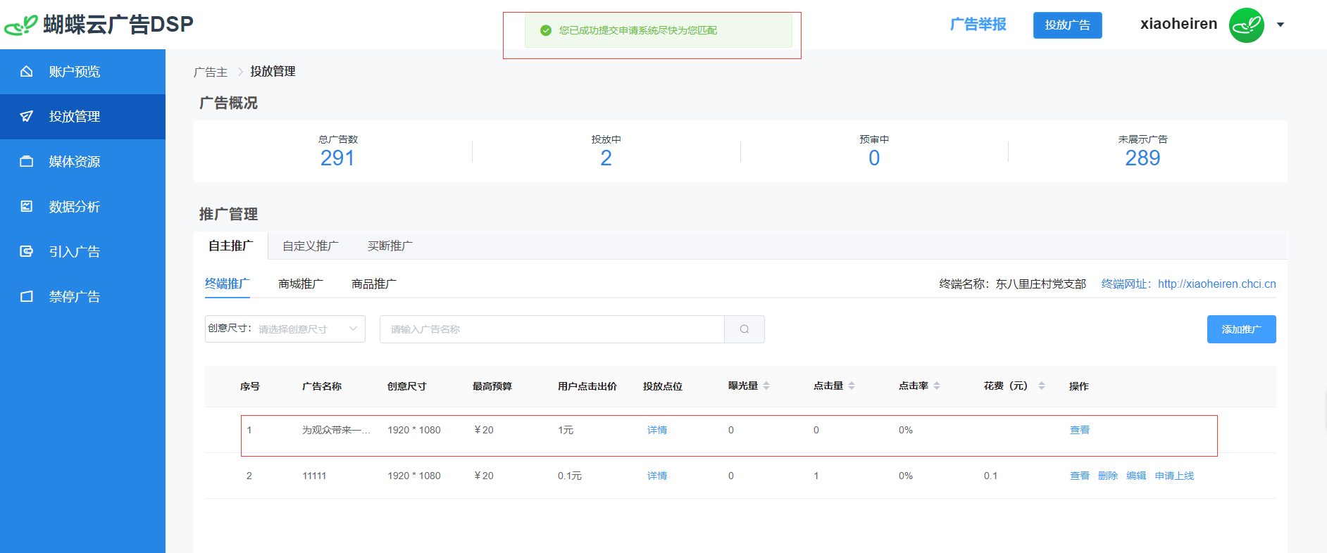 (8)提交成功后会提示“成功提交申请系统尽快为您匹配”,在广告商预审之后,才可进行下一步。