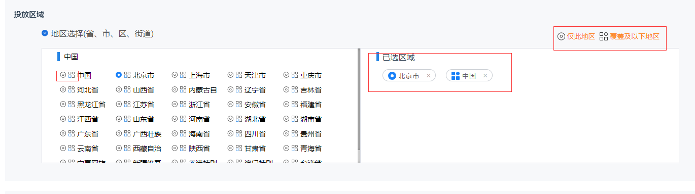 (1)投放地区:选择需要投放的地区,点击选择圆形小图标代表仅在此地区投放,方形小图标代表在该地区以下覆盖的所有地区投放。