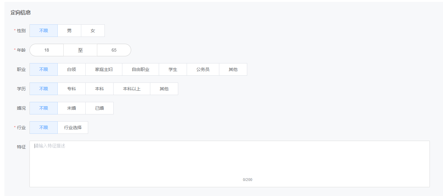 (2)定向信息:选择性别、年龄、职业、学历、婚况和行业,如下图。(注:带*号是必填项)。