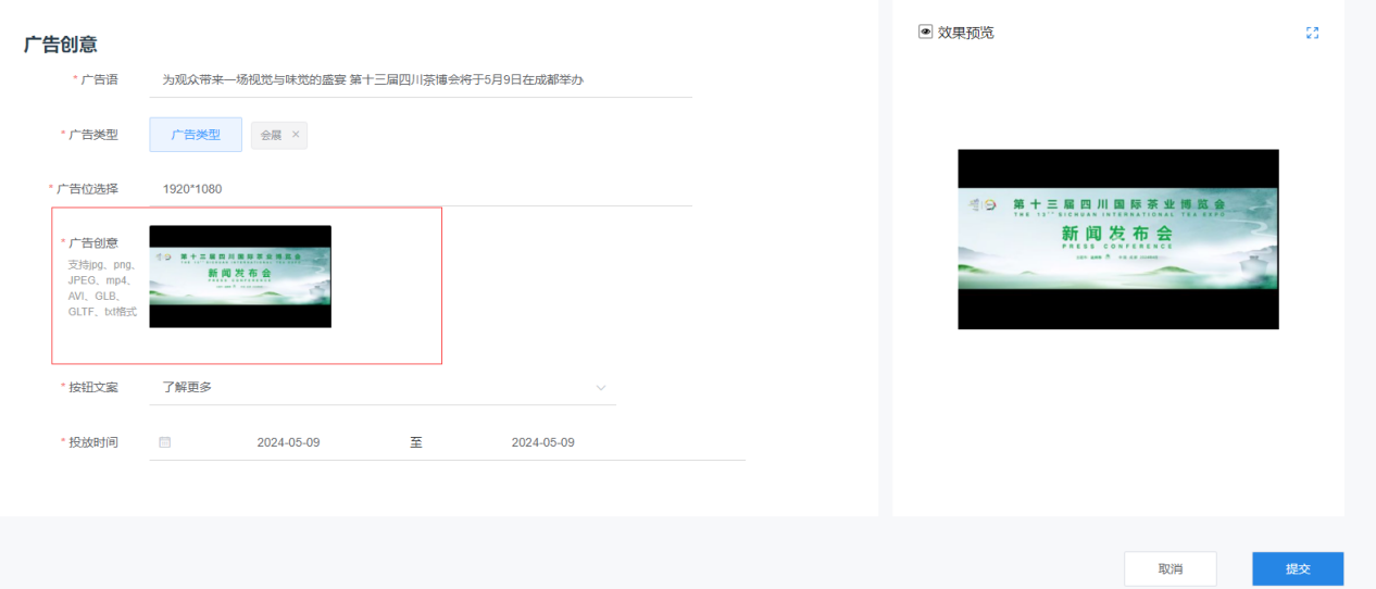(5) 添加广告创意:(支持jpg、png、JPEG、mp4、AVI、GLB、GLTF、txt格式,文本:txt,10字≤字数≤280字图片:JPG/JEPG/PNG,大小≤3M视频:MP4,AVI, 大小≤500M,5s≤时长≤60s 3D(全息影像、VR):GLB, GLTF, 大小≤500M)如下图。目前上传的3D模型不能显示。