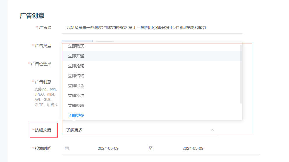 (3)广告创意:输入广告语,选择所对应的广告类型。
