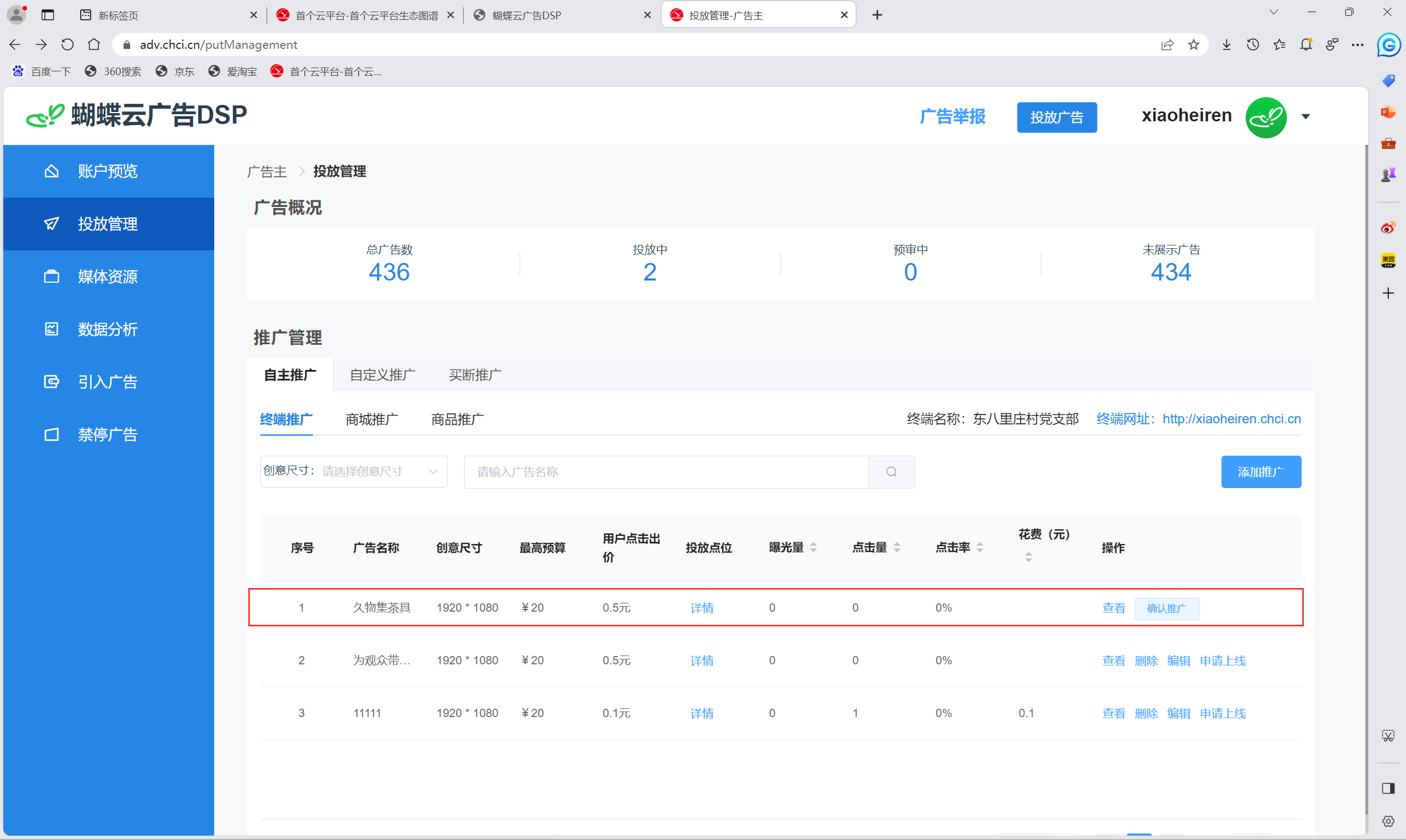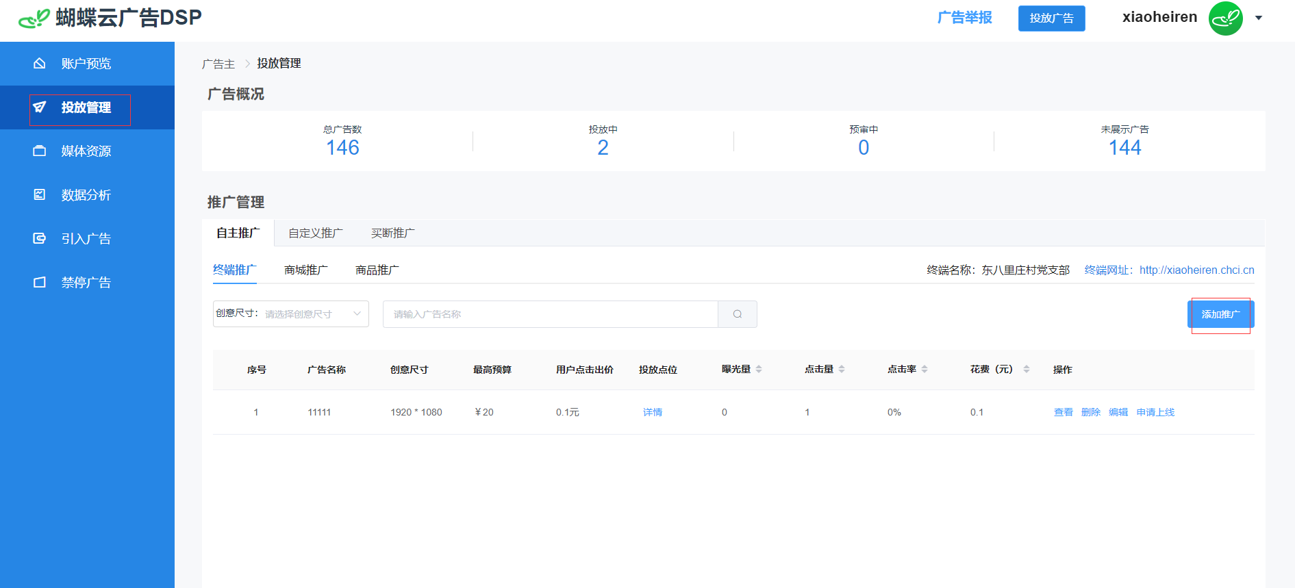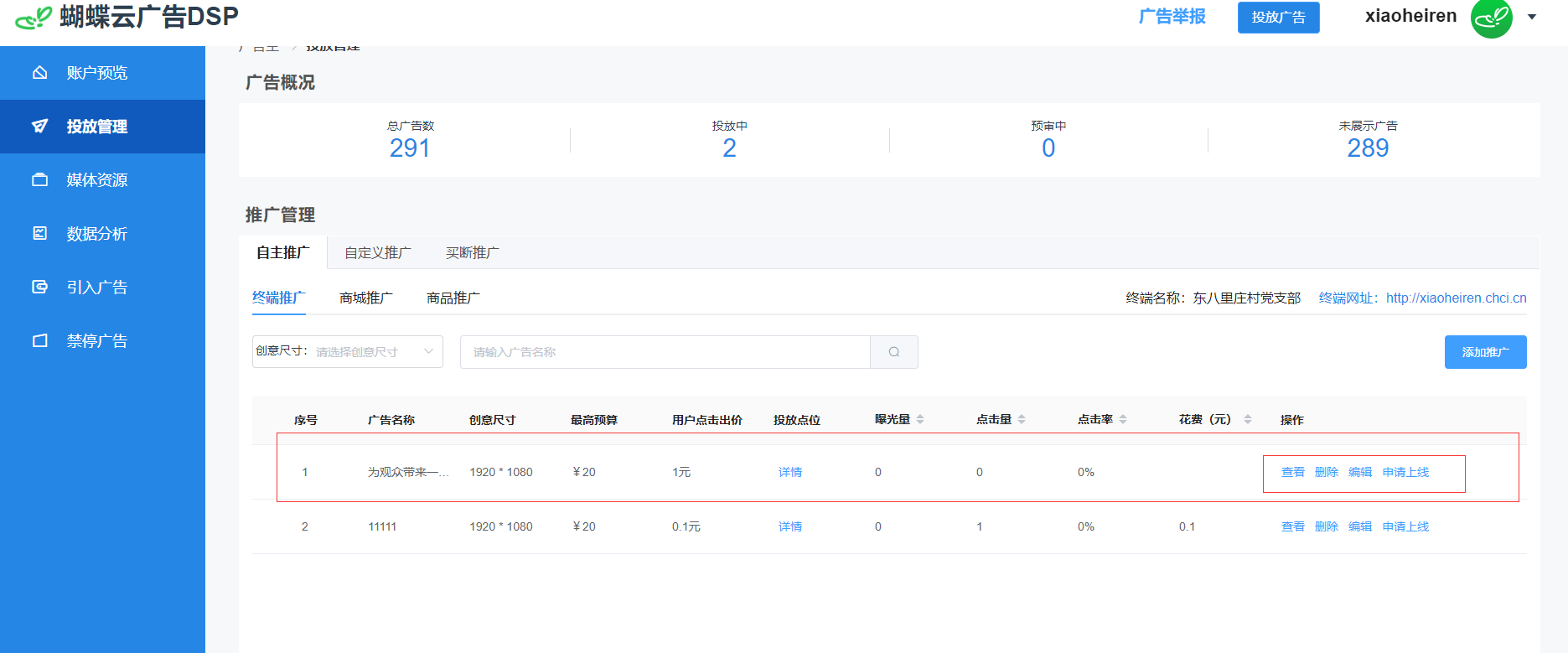 (9)在推广管理内,找到刚刚发布的广告,可进行查看、删除、编辑、申请上线。