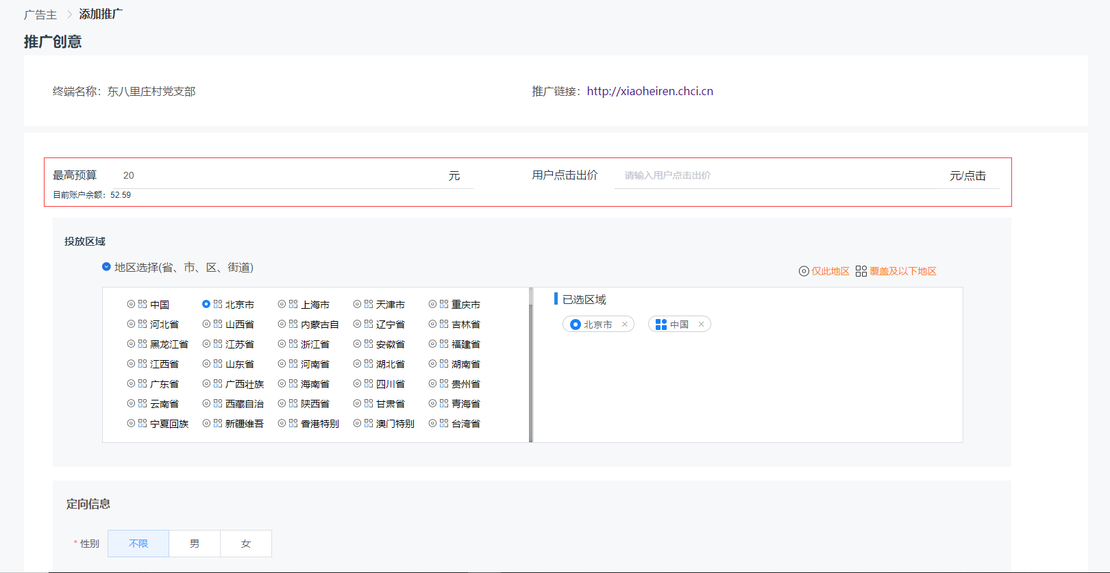 3.1点击推广管理下的“添加推广”,可进入添加广告页面(分别包括“投放区域”,“定向信息”,“广告创意”三个板块)进入添加推广页面后,首先输入最高预算与价格,(注:最高预算价格不得低于20元)如下图: